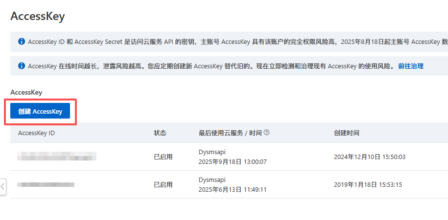 2)勾选我确认知晓云账号 AccessKey 安全风险协议并点击确认“继续使用云账号 AccessKey”按钮进入下一步操作;