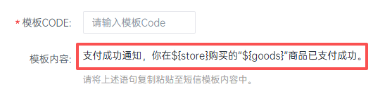2.开启付款成功通知短信,复制“支付成功通知,你在${store}购买的“${goods}”商品已支付成功。”