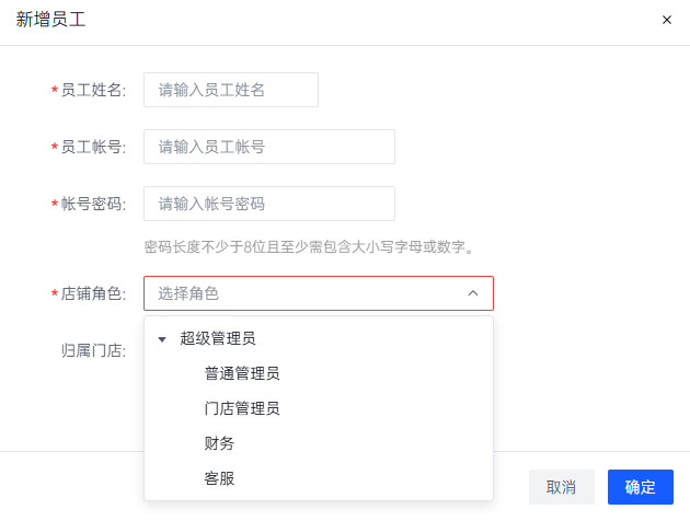 员工管理模块内置了普通管理员、门店管理员、财务与客服四个角色属性,商户可添加相应的角色来获得角色权限,该模块与员工权限关联,具体的菜单权限可在员工权限菜单下进行编辑管理。