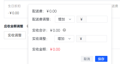 在订单进入已完成状态后系统还提供了订单最终的结算调整功能,该功能将是调整订单金额最后的流程,实收调整分为配送费和实收调整两部分,最后调整数据将结算为实收金额下,实收金额将为该条订单最后的金额数据,一旦确认操作后订单数据将不可逆,请谨慎操作;