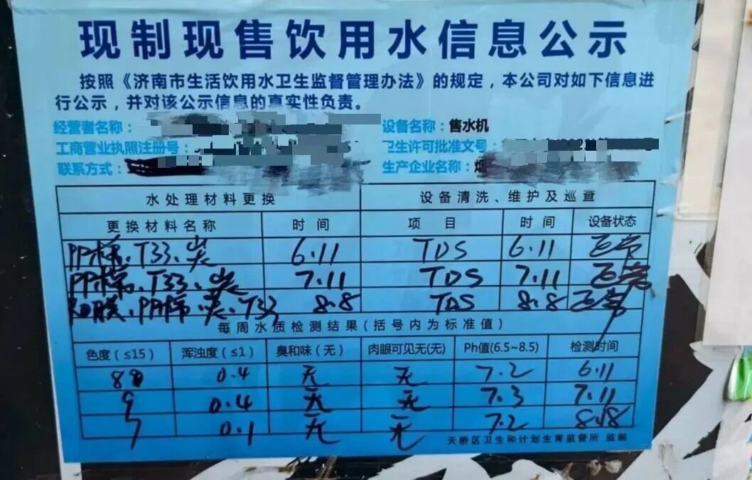 事实上,济南市早在2017年就对现制现售饮用水经营企业做出了统一规范性要求,要求注明经营者的基本信息,公示水质检测报告、卫生许可证、从业人员健康证等信息。